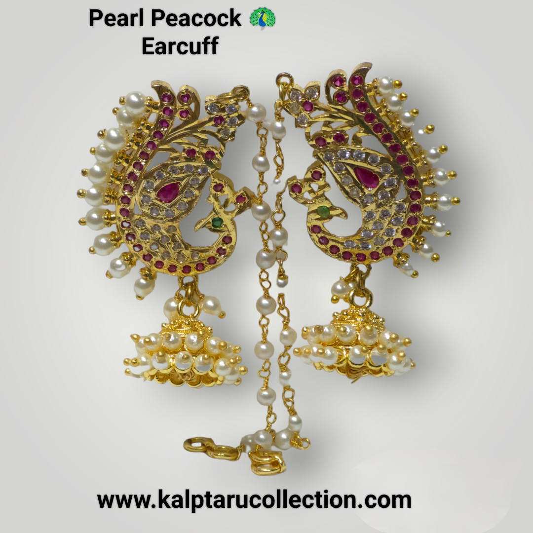 Premium quality goldplated japan pearl american diamond peacock shape EARCUFF to style with your saree / nauvari saree.